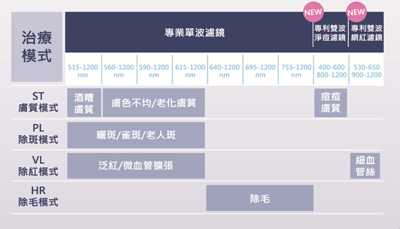 A: 彩衝光有各式的專家濾鏡與OPT(做好做滿的完美脈衝科技), 因此不需要使用高能量就可有效針對各種皮膚狀況做治療, 病患皮膚的安全性與治療有效性更高