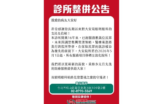 5/1起,大安双眼明眼科整併至敦化院所