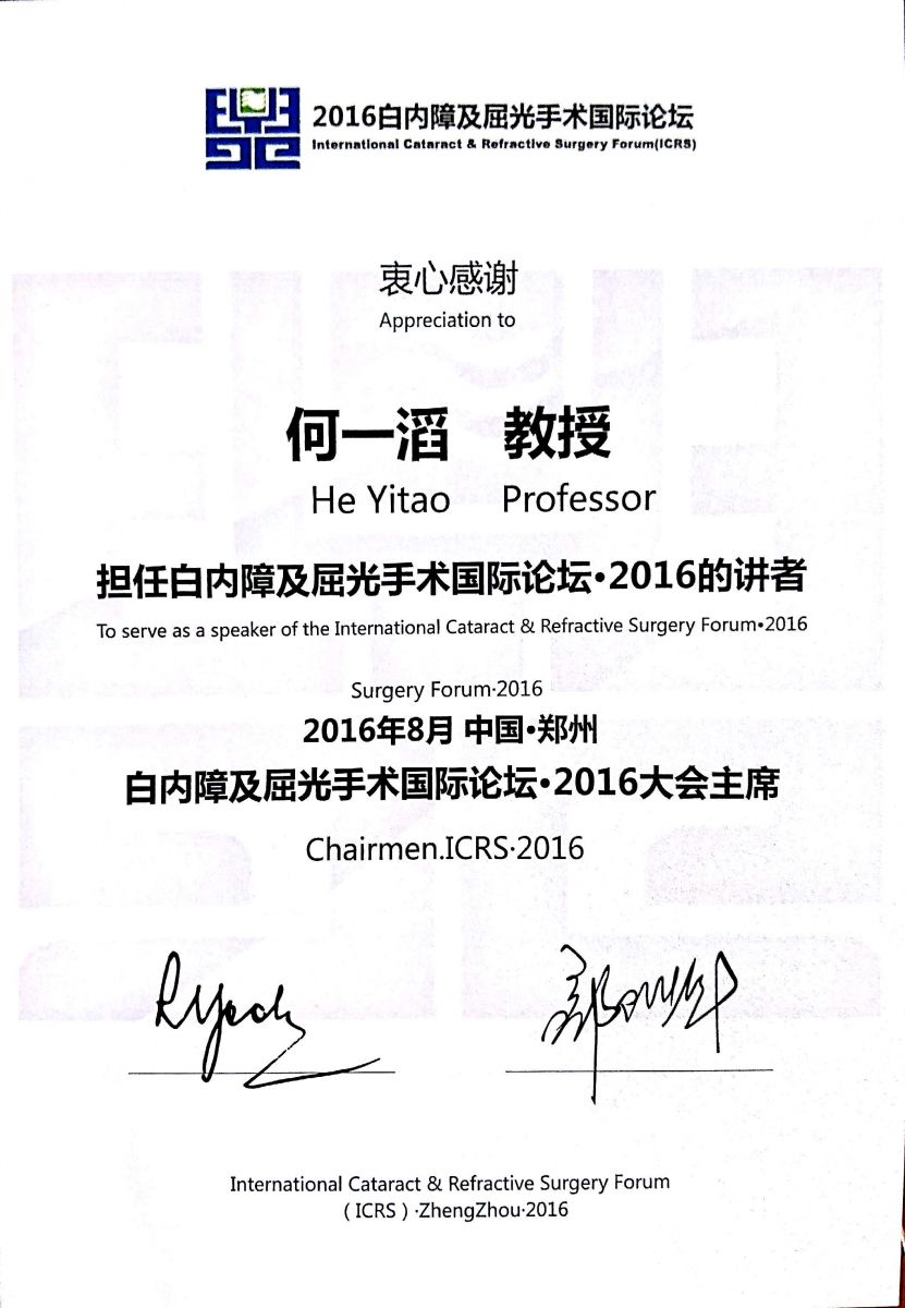 2016年的白內障及屈光手術國際論壇於8月11日在鄭州舉辦。 双眼明眼科總院長何一滔醫師以台灣白內障專家的身分, 受邀參加此次盛會,並於會中以< 高科技對現代屈光白內障手術的影響>為題,進行了專題演講, 與現場眾多眼科醫師分享個人豐富的手術經驗。