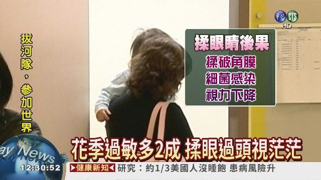 每年櫻花盛開,總是吸引大批遊客潮聖,花季即將來臨,賞花的背後卻隱藏著,過敏危機,眼科醫師呂大文,醫師說,每到賞花季節,因花粉而眼睛過敏的患者,會增加二成,而且大多是小朋友,一癢就用力揉眼,可能揉破角膜,嚴重恐造成細菌感染或視力下降,眼科醫師呂大文,花粉除造成眼睛過敏外,可能也伴隨打噴嚏、流鼻水,或皮膚過敏等,嚴重可能出現氣喘發作,醫師提醒,曾經因為花粉誘發過敏的民眾,還是避開為妙,尤其三、四月花季,更要特別注意。