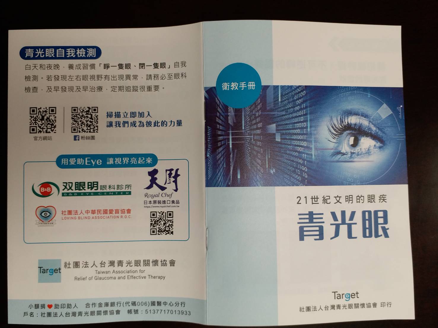 該協會為加強民眾取得醫療資訊的多元管道,今年更印行了<21世紀文明的眼疾~青光眼>衛教手冊,並獲得社團法人中華民國愛盲協會、双眼明眼科診所、天廚國際股份有限公司等單位的經費贊助。手冊內容包括症狀、類型、治療、照護須知、常見問題,分門別類的具體涵蓋,該手冊將免費提供給需要的民眾。