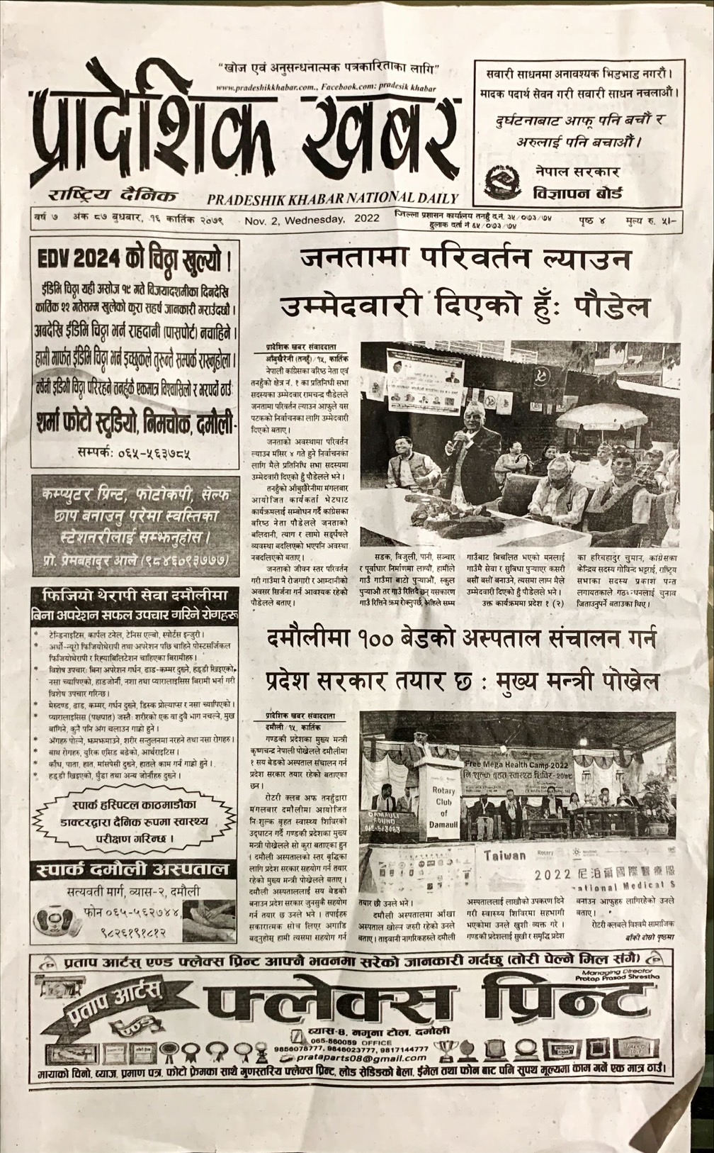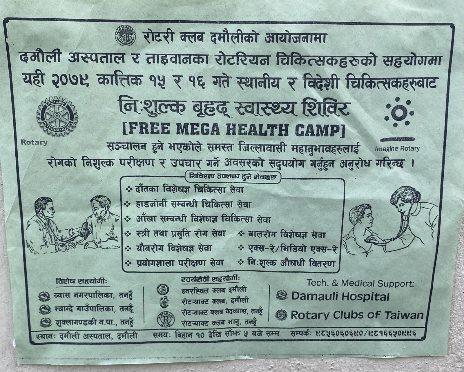 2022年10月28日從台灣出發的醫療志工人員總數高達80位以上,抵達之後,再與尼泊爾30位醫師和100位以上的當地志工合作,於11月1日起展開為期2天的義診,Damauli 當地報紙,在團隊抵達的第一天,即以頭版做了大篇幅的報導。活動是在Damauli 比亞斯醫院廣場進行,根據兩國聯合醫療團隊的估計,共有5,184位尼泊爾民眾接受了診療,因為許多人都看了不只一個科別,所以醫療團隊所執行的診療超過10,000人次以上。尼泊爾健康及人口部長Hon.Bhawani Prasad Khapung也與醫療團隊晤面,感謝團隊對尼泊爾的鼎力協助,充分展現了醫療無國界的愛心義舉。