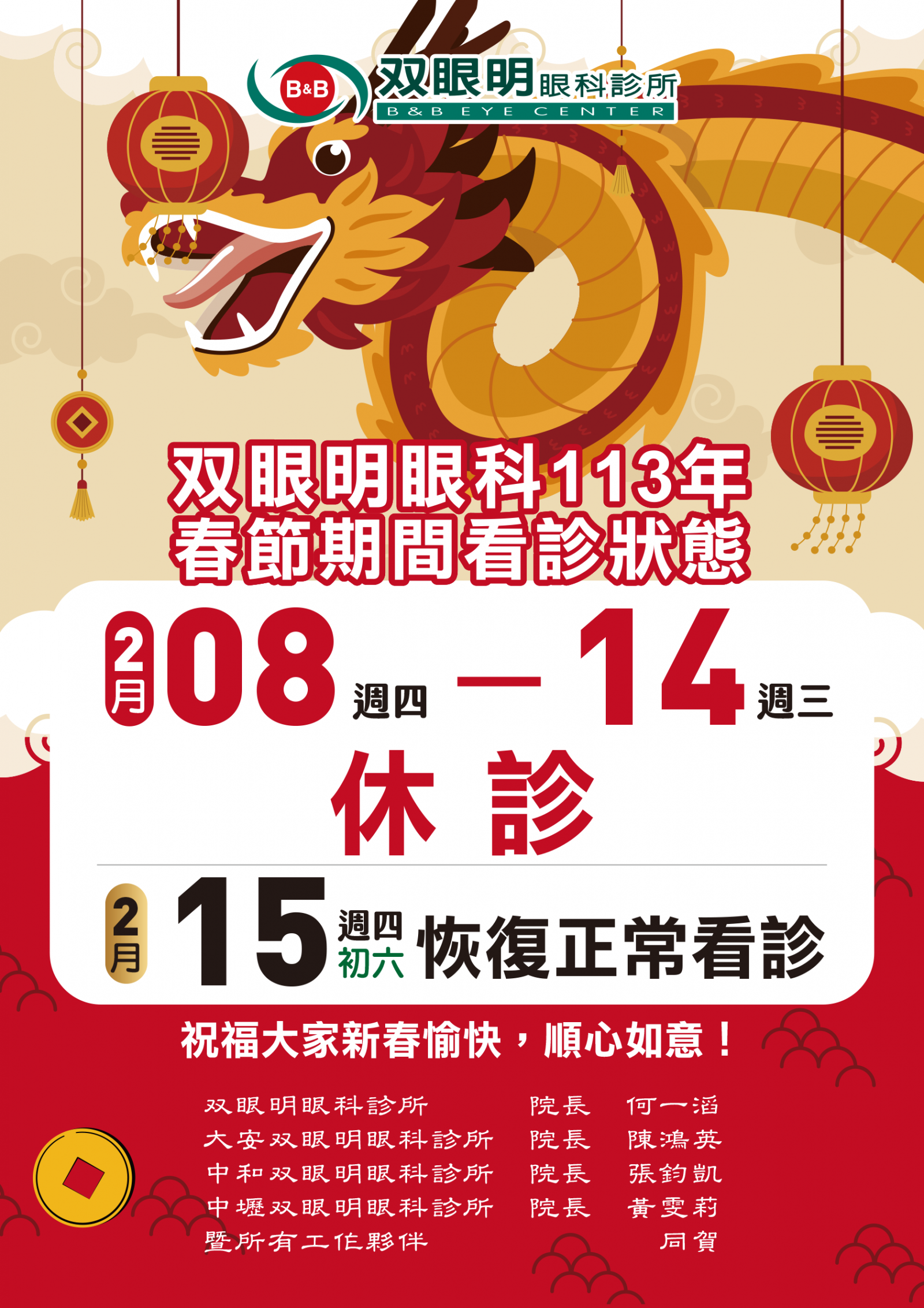 双眼明眼科113年春節期間休診及看診狀態