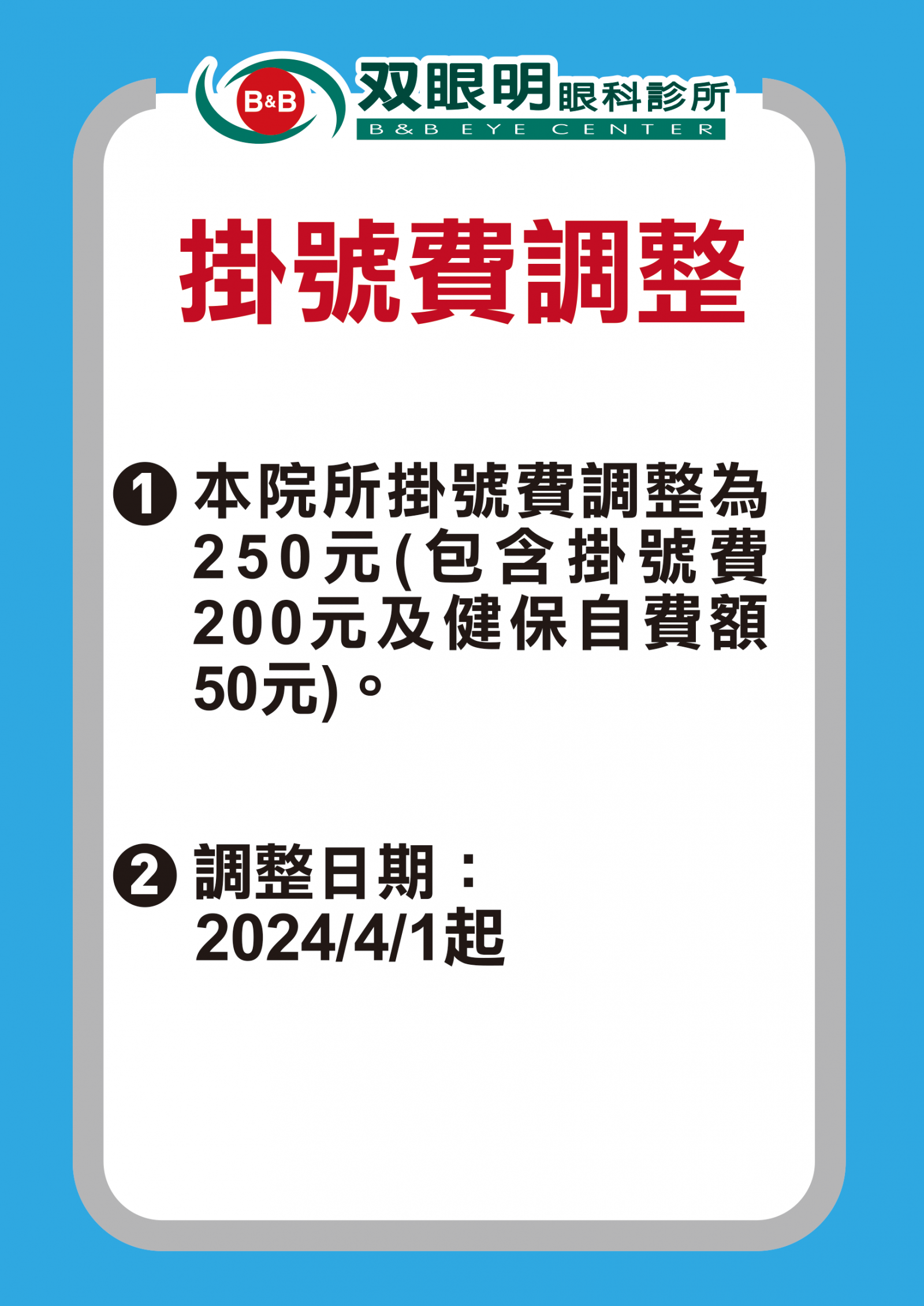 2024/4/1起,掛號費調整-中壢院所