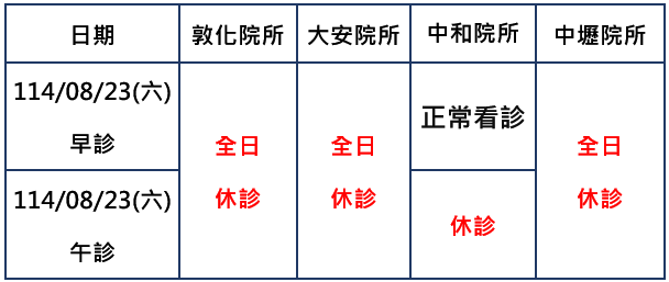 114/08/23(六)双眼明體系之院所看診狀態如下: