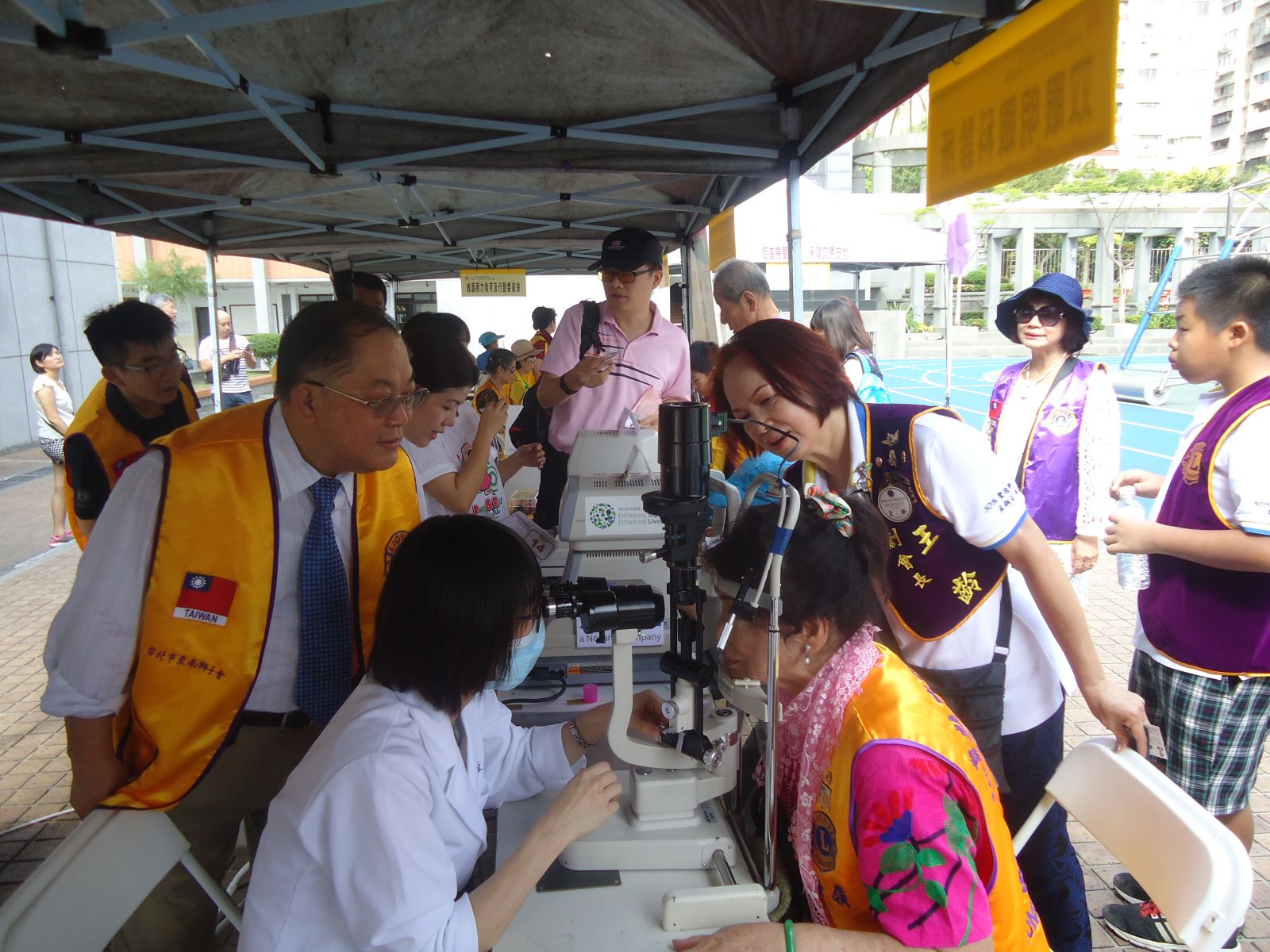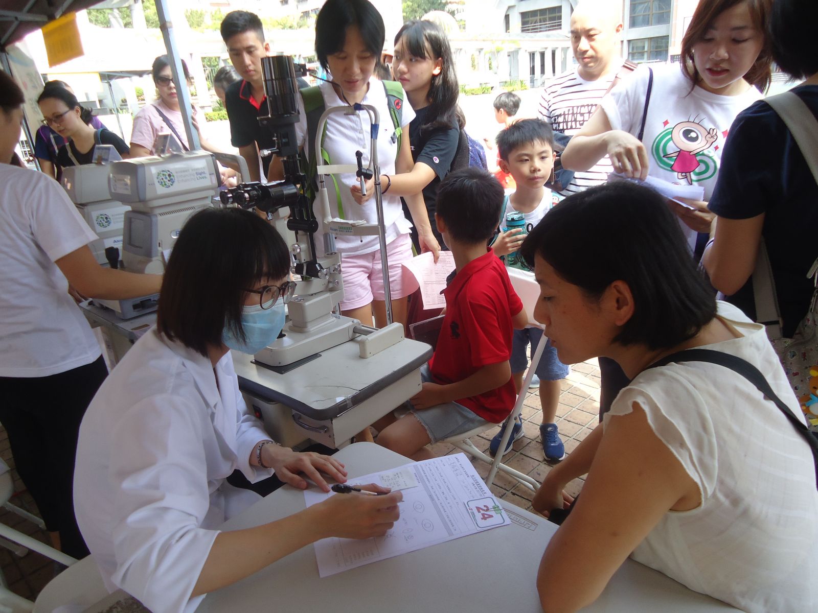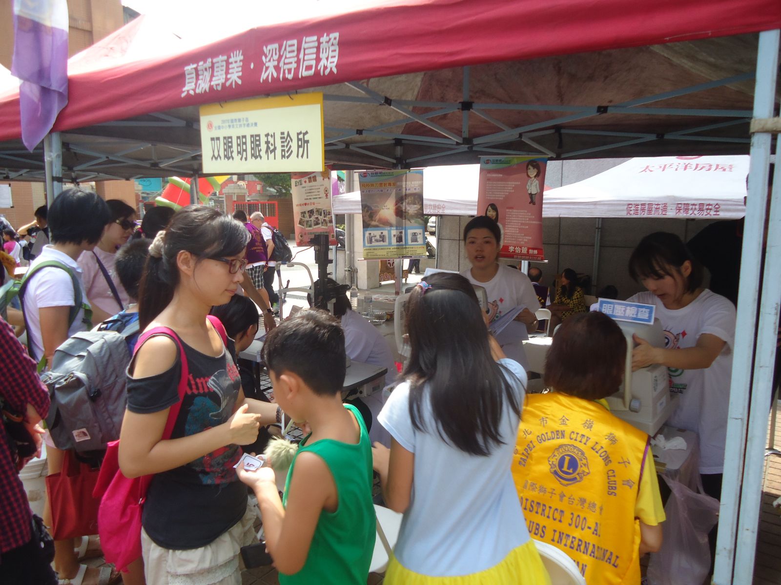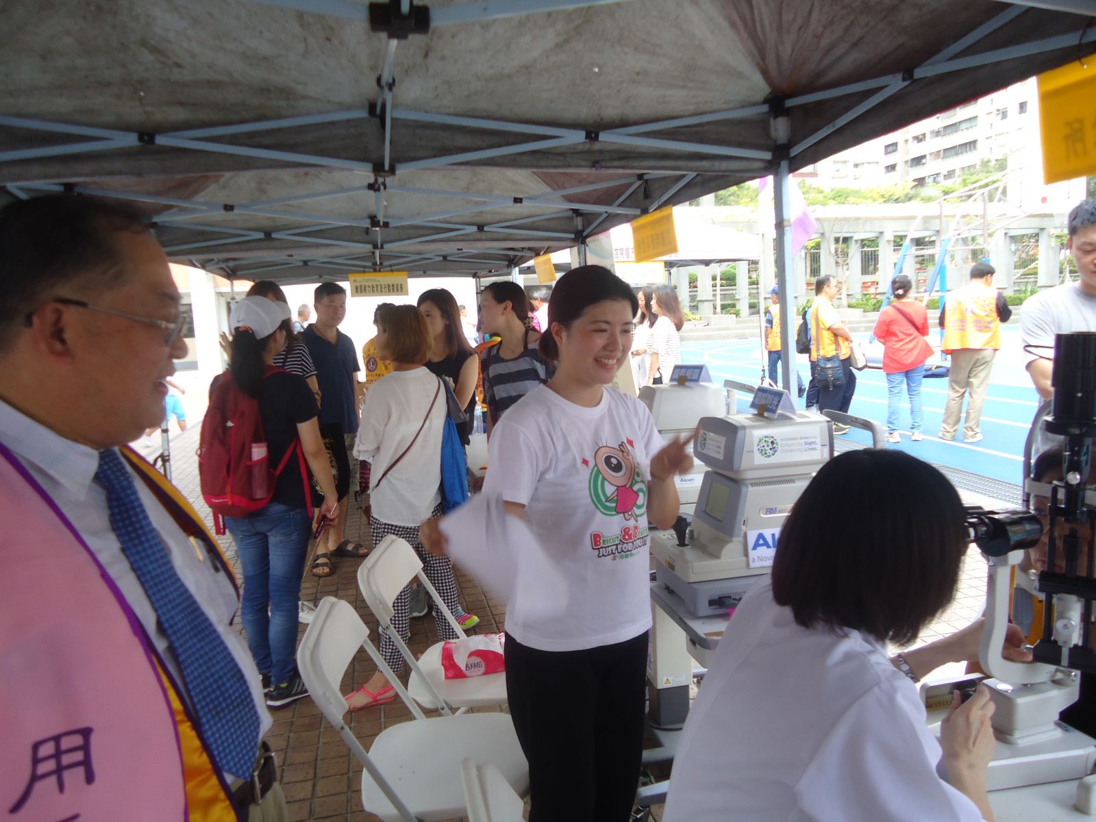 在整個活動中,双眼明眼科的義診團隊接受了超過150位民眾的登記受檢,所有工作人員全程無休,在烈日當空下,雖然大家的額頭都沁出了汗水,但是大家都沒有時間去擦拭,全神貫注於自己負責的工作項目。李怡萱醫師亦是不畏天氣的炎熱,仍然堅持穿著材質頗厚的醫師白袍,專注於裂隙燈前,仔細的為民眾檢查眼睛,並且詳細的解說。