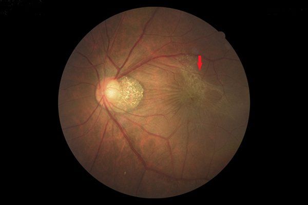 ▲眼底檢查可見到明顯的纖維增生膜(紅色箭頭)拉扯黃斑部。(圖/王元聖醫師提供)